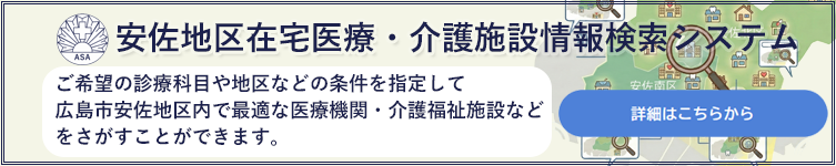 安佐地区は、以前より地域の医療介護関係者の方々の尽力により、医療介護連携に係る様々な取組が実施されてきております。当センターは、それらの取組を中心としながら、地域の医療介護関係者の皆様方とともに、安佐地区の医療介護連携の推進に取り組んでまいりたいと考えております。